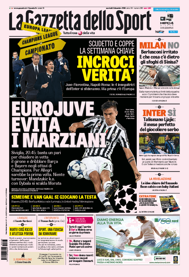 La Gazzetta dello Sport parla della Juventus che dovrà giocare contro il Siviglia e basterà un pari per il primo posto.