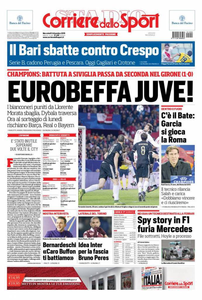 Il Corriere dello Sport ha parlato della Juventus beffata a Siviglia dal gol dell’ex Llorente e passa come seconda.