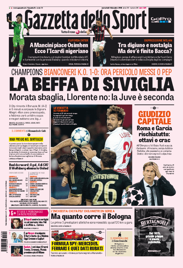 La Gazzetta dello Sport parla della Juventus che perde a Siviglia per uno a zero a causa del gol dell’ex Llorente e passa come seconda.