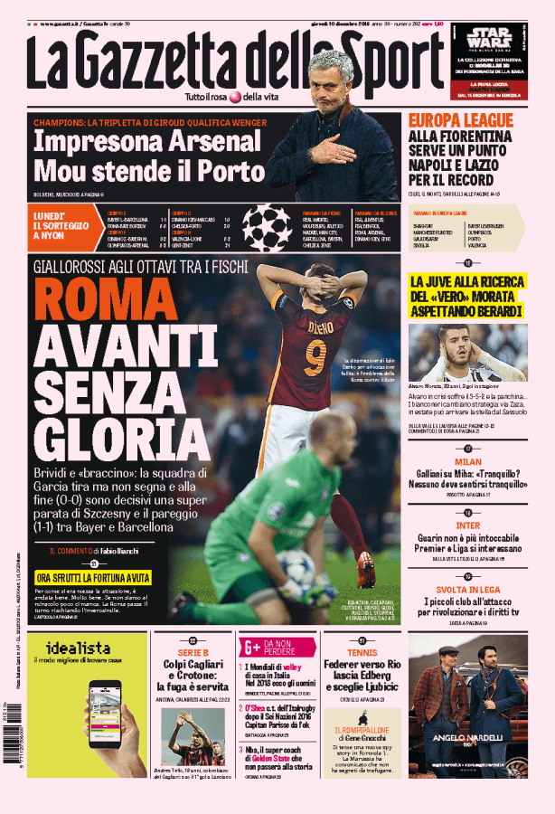 La Gazzetta dello Sport parla della Roma che pareggia in casa contro il Bate Borisov e vola agli ottavi di finale di Champions.