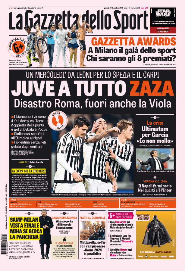 La Gazzetta dello Sport parla della Juventus che batte il Torino in Coppa Italia per quattro a zero con doppietta di Zaza e gol di Dybala e Pogba.