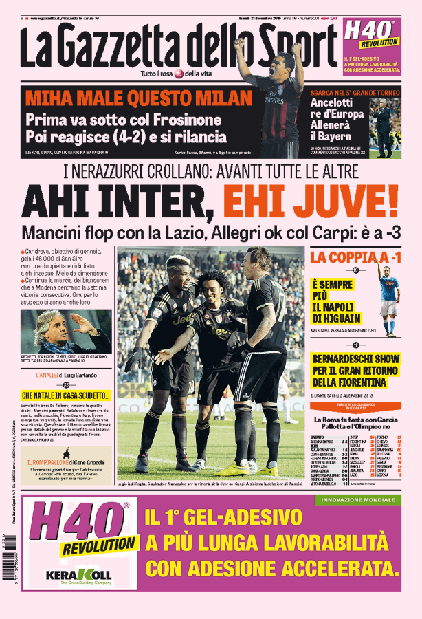 La Gazzetta dello Sport parla della caduta dell’Inter contro la Lazio e della vittoria della Juventus che si porta a meno tre.
