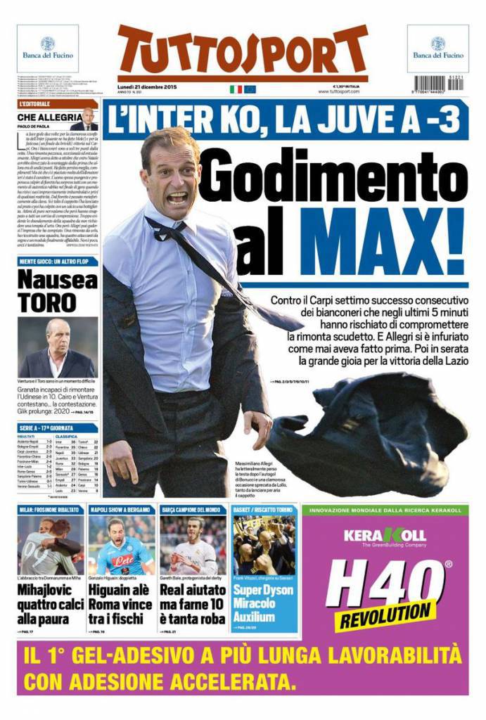 Su Tuttosport si parla della Juventus che vince tre a due a Carpi e vola a meno tre dalla vetta con l’Inter che perde in casa contro la Lazio.
