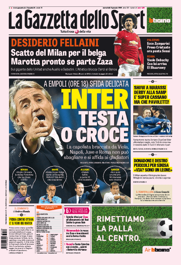 La Gazzetta dello Sport parla dell’Inter che dovrà giocare a Empoli alle 18 e non dovrà cedere il passo alle inseguitrici.