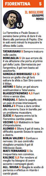 Colpaccio della Lazio di Stefano Pioli che, in trasferta, batte la Fiorentina e porta a casa tre punti fondamentali. Nella squadra viola, nei voti della Gazzetta dello Sport, il migliore è Giuseppe Rossi che, in soli venti minuti ha fatto impazzire la difesa della Lazio. Nella squadra biancoceleste, invece, il migliore è Biglia: recupera decine di palloni, protegge la difesa e fa ripartire la squadra.