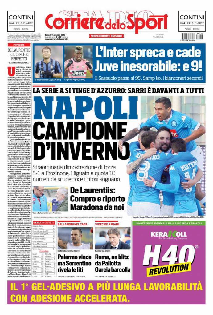 Il Corriere dello Sport parla del Napoli che vince cinque a uno a Frosinone e si laurea campione d’inverno.