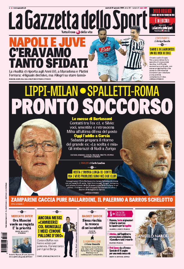 La Gazzetta dello Sport parla di Milan e Roma pronte ad affidarsi a due tecnici esperti come Lippi e Spalletti.