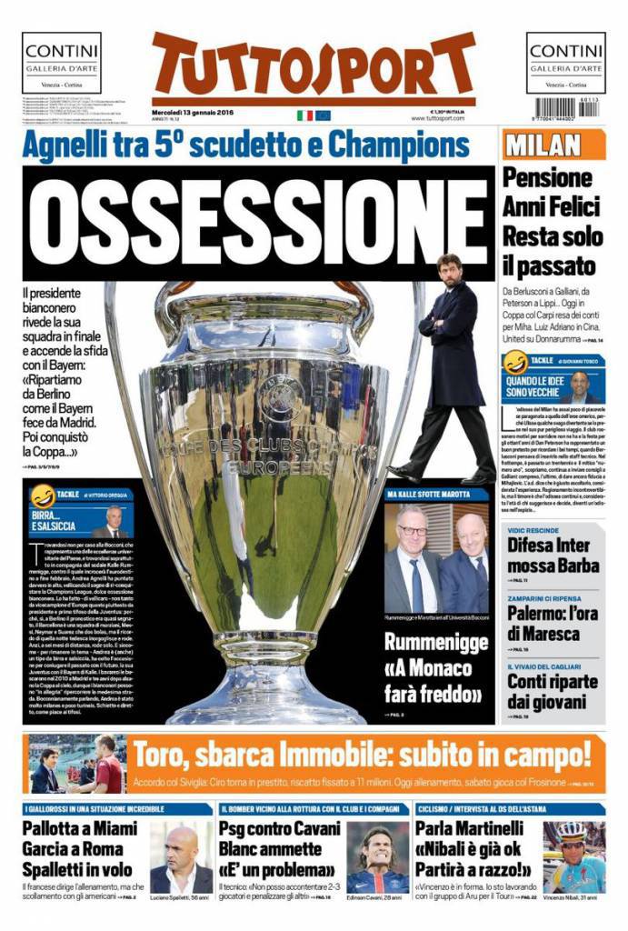 Su Tuttosport si parla di Agnelli che vuole vincere il quinto Scudetto consecutivo ma soprattutto ha voglia di alzare la Champions League.