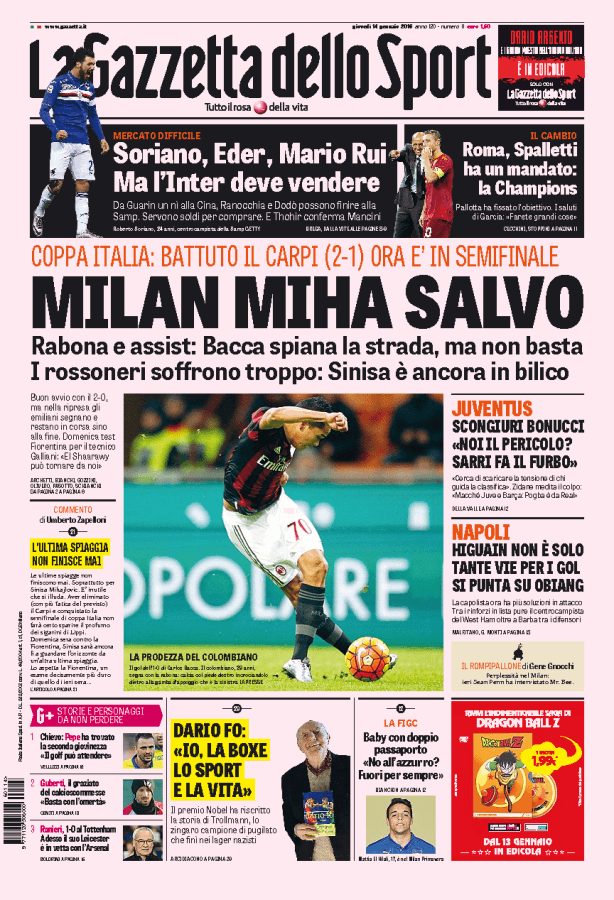 La Gazzetta dello Sport parla del Milan che vince due a uno contro il Carpi e la panchina di Mihajlovic è salva.