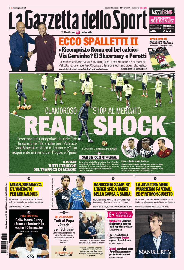 Gazzetta dello Sport – Real Shock 15/01/2016 di Ruggieri La Fifa ha bloccato il mercato del Real Madrid per un anno e quindi addio a Pogba e Pjanic e Morata resterà a Torino. Samuele Roccati