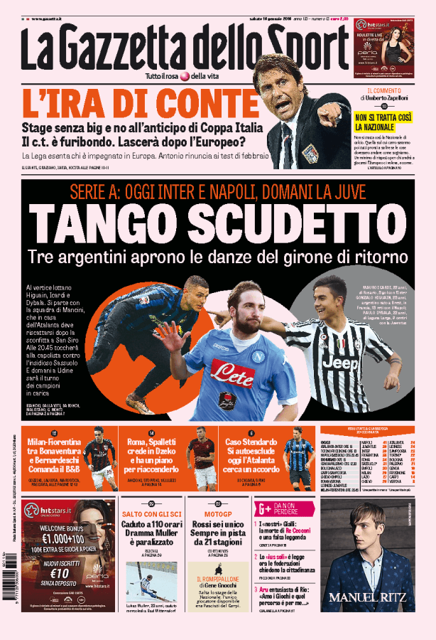 La serie A riparte oggi pomeriggio con l’Inter di scena a Bergamo contro l’Atalanta, questa sera il Napoli di Higuain.