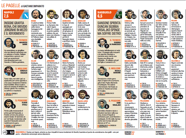 E’ un Napoli da sogno quello che batte il Sassuolo per 3-1, vola in vetta e tenta la fuga. Merito di un grandissimo Gonzalo Higuain che arriva a quota 20 gol in altrettante partite. El Pipita è il migliore della formazione di Sarri anche nelle pagelle della Gazzetta dello Sport: tanta roba – si legge sul quotidiano – non solo i gol. Va applaudito per come sgomita e crea spazi rendendo il tridente imprevedibile. Re e suddito: sa soffrire e trascinare. Rimandato, invece, Hysaj: perde palla innescando il primo gol del Sassuolo. Si riprende un po’ nel finale. Nel Sassuolo, invece, il migliore è Sansone, devastante a inizio gara.
