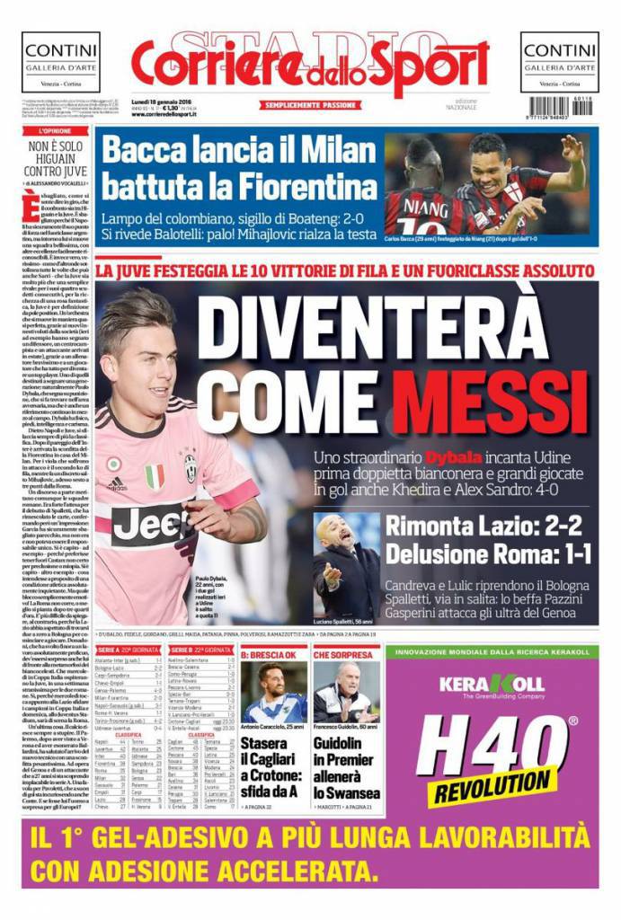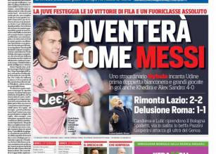 Corriere dello Sport – Diventerà come Messi 18/01/2016 di Ruggieri Il Corriere dello Sport parla di Dybala che secondo molti addetti ai lavori diventerà come Lionel Messi. Già dieci gol in stagione. Samuele Roccati