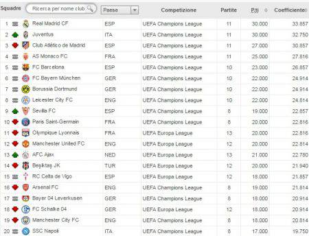 ROMA – Dopo la semifinale di andata di ieri di Champions League tra Monaco e Juventus, la Uefa ha aggiornato il Ranking Club per coefficienti stagionali. Buffon e compagni, dopo il 2-0 del ‘Louis II’, compiono il sorpasso ai danni dell’Atletico Madrid di Diego Pablo Simeone e ora sono secondi alle spalle del Real Madrid. Inseguono Monaco e Barcellona, mentre il PSG è solo decimo. Ecco le prime dieci posizioni con relativo punteggio: