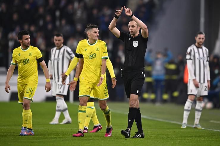 Al di là di quello che sarà il futuro a partire dalla prossima sessione estiva di calciomercato, la ‘Vecchia Signora’ ha il dovere di provare a chiudere nel migliore dei modi l’annata. E il percorso europeo, dopo l’eliminazione dalla Champions League, può ancora riservare sorprese alla squadra allenata da Massimiliano Allegri. Ne ha riservate, ieri, nel match d’andata degli ottavi di Europa League, di scena all’Allianz Stadium, contro il Nantes. Un 1-1 che lascia l’amaro in bocca e mette a rischio la possibile qualificazione, anche se mancano 90′ e la Juventus ha dimostrato di essere all’altezza. Quello che è accaduto ieri sera a Torino, però, ha scatenato letteralmente il caos. Perchè la decisione del direttore di gara Pinhero, praticamente allo scadere, ha di fatto tagliato le gambe alla Juventus. Il rigore non assegnato al 95′ per il fallo di mano, evidente, di Centonze sul quasi gol di testa di Bremer. La Var ha richiamato l’arbitro portoghese che ha decretato per il fallo del centrale bianconero.