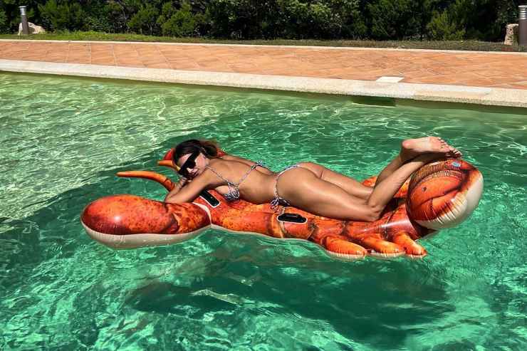 Elisabetta Canalis, distesa sul materassino in piscina è illegale: perizoma che attira subito la voglia di zoom