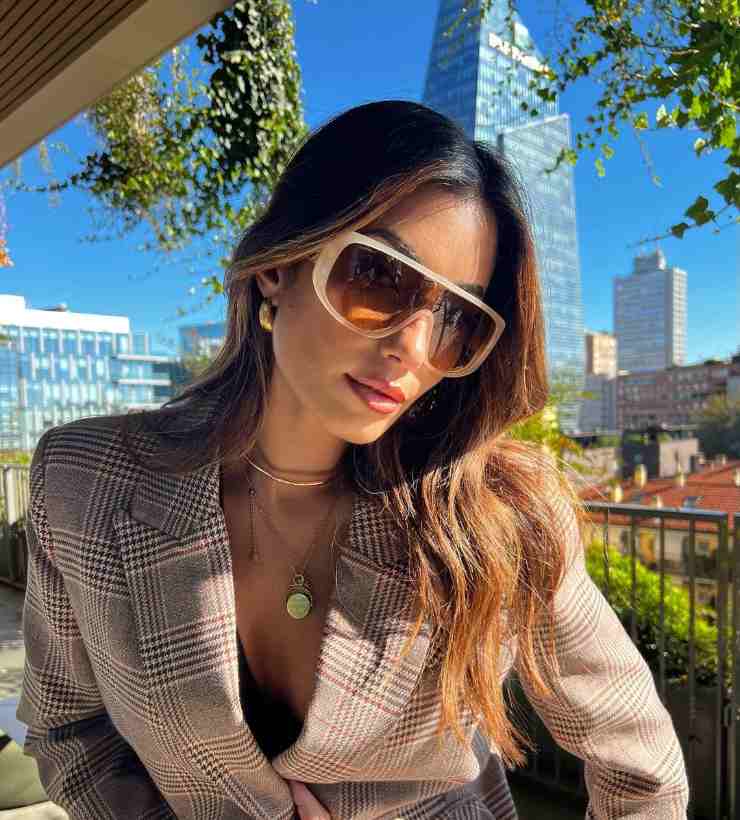 Giacca marrone a scacchi, occhiali da sole ed una scollatura che fa solo intravedere le grazie dell’ex velina che rimane una delle donne più amate e desiderate del mondo della televisione e non solo.