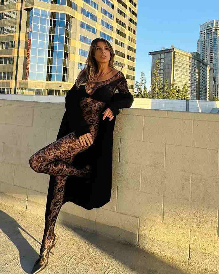 Nella foto in questione possiamo ammirarla posare per Calzedonia, con indosso una tuta trasparente di pizzo nera.